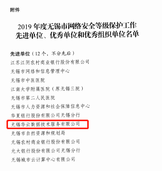 2020年2月19日,2019年度无锡市网络安全等级保护工作先进单位、优秀单位评比结果正式通报。经过严格的初审、主题汇报和专家评判等流程,华云数据凭借在网络安全方面的优异工作表现被评为2019年度无锡市网络安全等级保护工作先进单位。